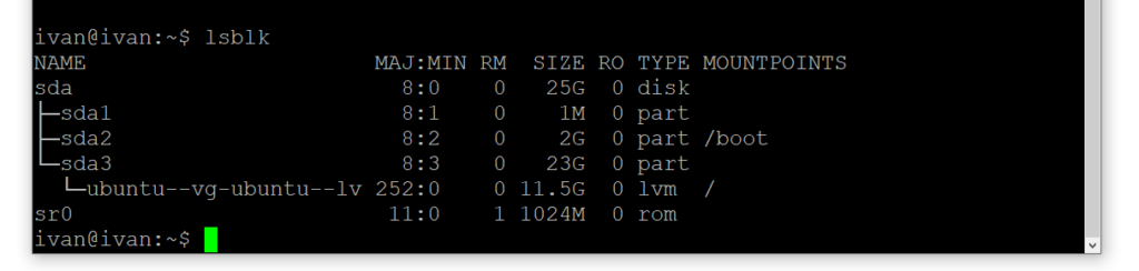 - lsblk- выводить места хранения даных
